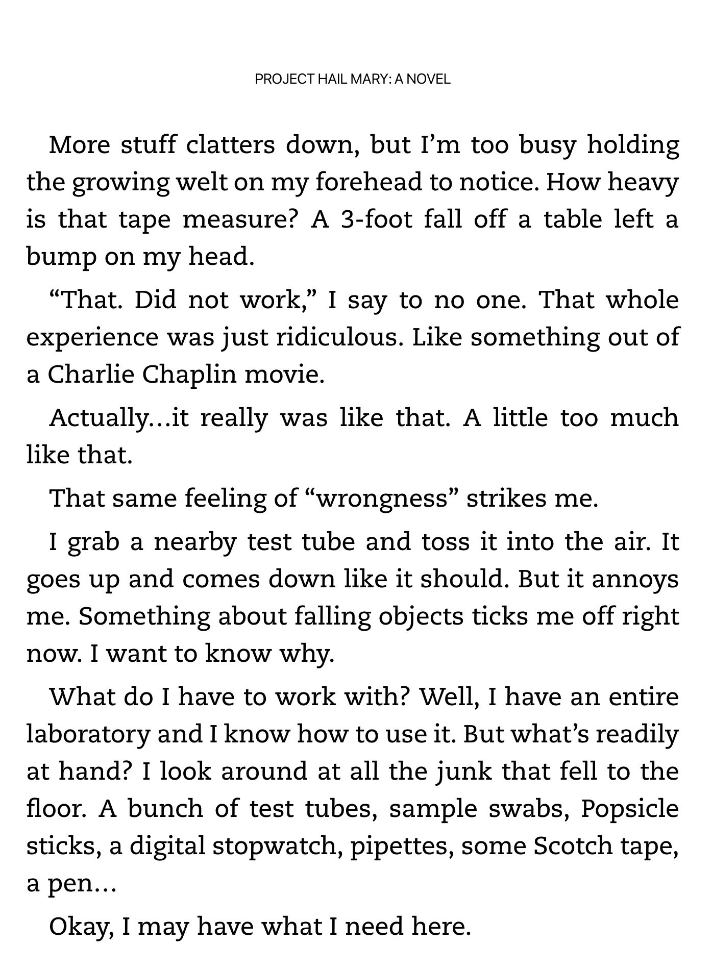 In the opening pages of the novel, Ryland Grace wakes up unsure of where he is — or even who he is — but aware enough to notice that something feels off. Following up on those instincts, he does a physics experiment.