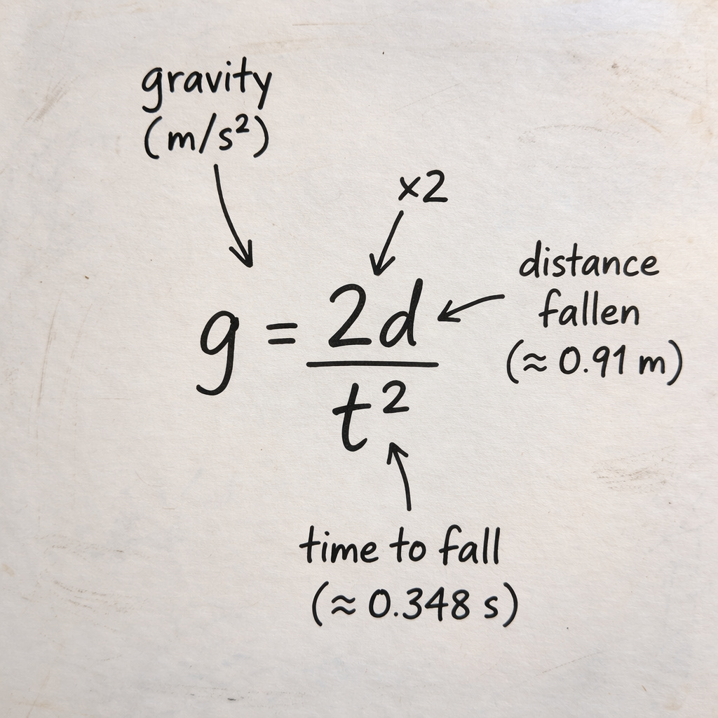 You can do the same experiment Grace did here on Earth — just duplicate his method. Drop something a bunch of times. Aim for at least a meter of drop height, because your reaction time (how quickly you can start and stop a stopwatch) is locked in at about 0.250 seconds. Grace’s 91 centimeters? Right at the edge of the sweet spot.